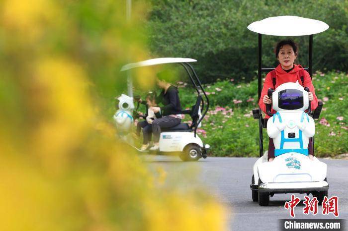 游客乘坐伴游机器人在襄阳月亮湾湿地公园游玩。 杨东 摄