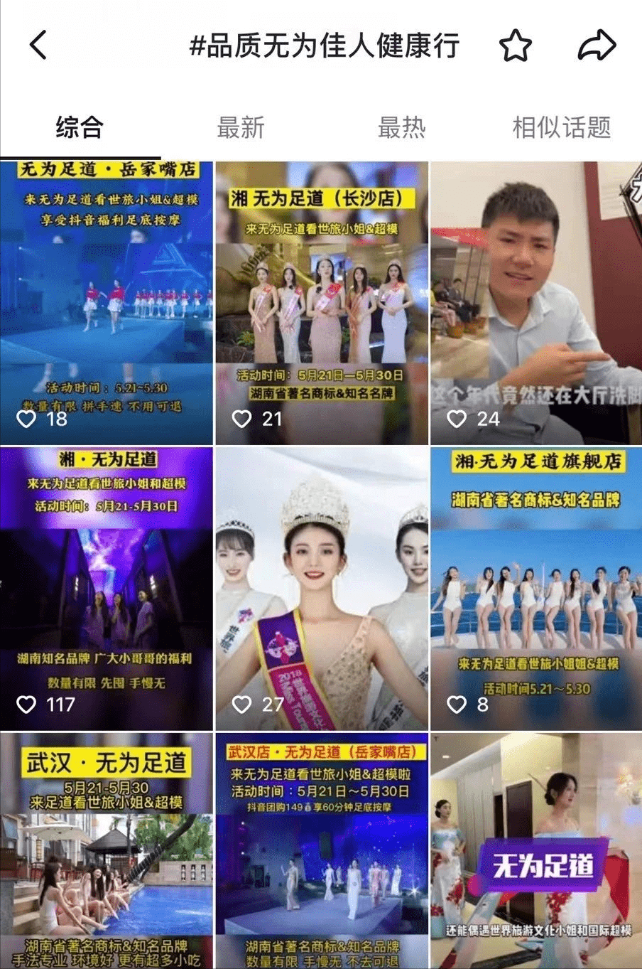 无为足道作为源自湖南的全国健康足疗连锁品牌,同时也作为世界旅游文化小姐大赛品牌战略合作伙伴。自2022年4月以来,在长沙、武汉连续举行两轮主题活动,网易、今日头条、搜狐、长沙晚报、新湖南等30多家媒体进行广泛报道,抖音及小红书等新媒体平台话题引爆达2000多万人次,无为品牌15家门店一周充值高达2500多万元。无为品牌自2022年尝到甜头后,与中尚超媒签署年度“全天候”无缝隙战略合作,以“世界旅游文化小姐”为名举行不同主题活动,如新媒体推广、无为“国潮大秀”、“汉服迎宾礼”10周年庆、无为VIP嘉宾西双版纳游、世姐直播特惠售卡等活动。
