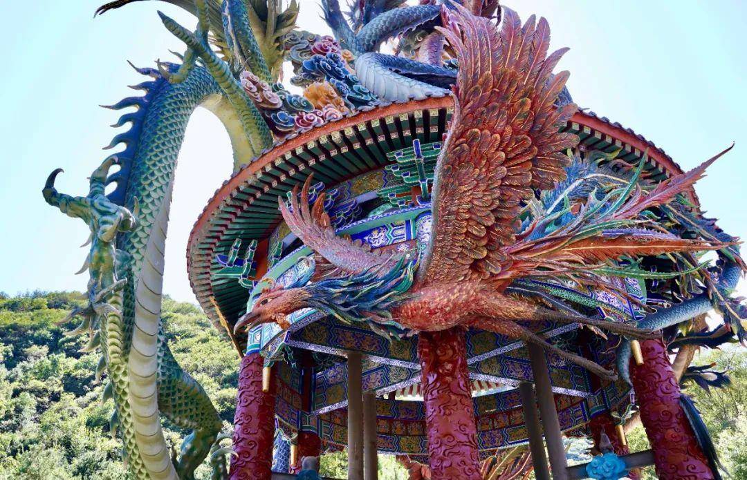 首先,多数巨型造像均置于室外,摆脱了空间的局限,便可自由伸展,佛像规模之大,别处难相比;其次,不但把佛像请出佛殿,造像风格更大胆张扬,标新立异,色彩更加艳丽,亦庄亦谐,与东南亚国家的十分类似,有极强的视觉冲击力,让人过目难忘。云雷阁题材构思取自佛祖诞生五龙护体的故事,只见五条好似刚刚跃出水面的张牙舞爪的飞龙,和从天而降的两只羽翼绚丽多彩的金凤绕柱盘旋,凤绕龙缠,造型炫酷,护佑七步生莲、单足站立、一手指天一手指地的幼年佛陀。