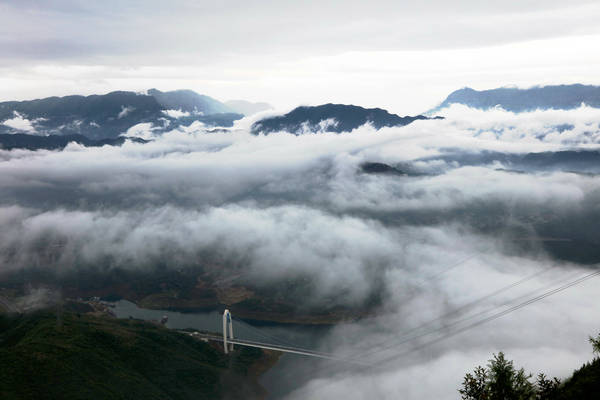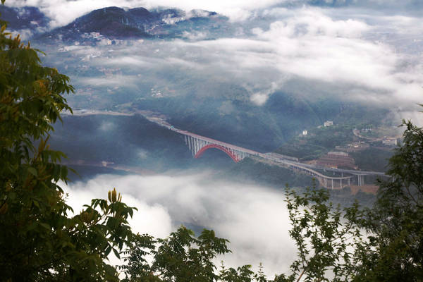 巫山机场路高铁路绕城路的小三峡桂花大桥常在云海中。(唐金生 摄)