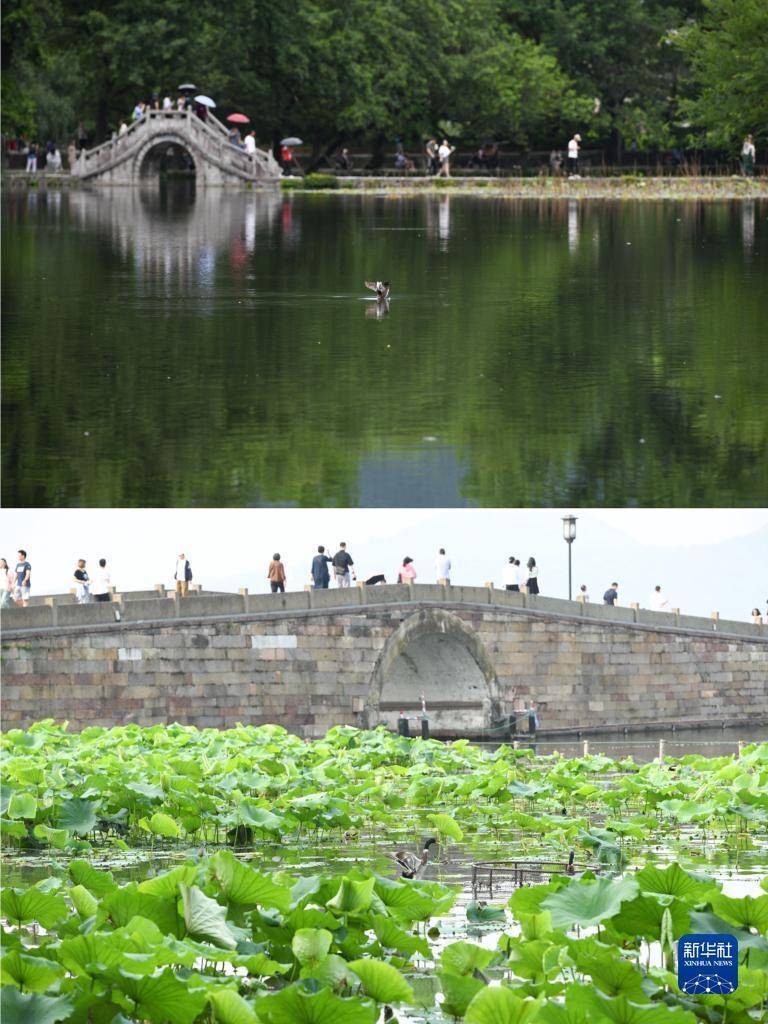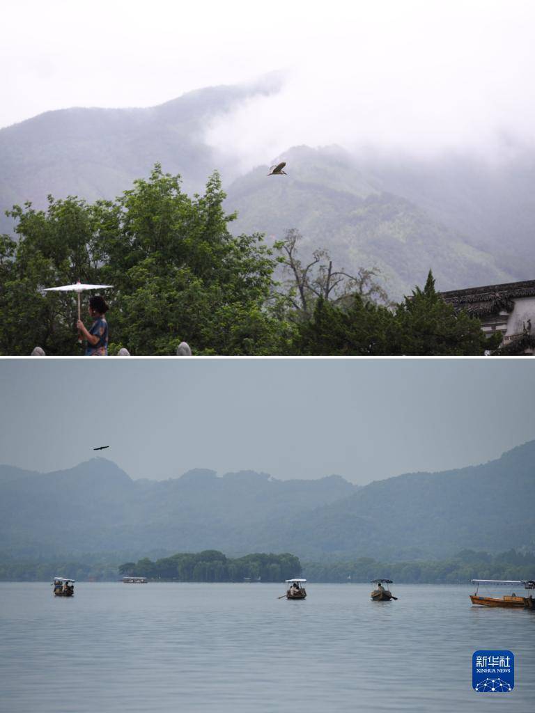 拼版图片:上图为5月31日拍摄的安徽省黄山市宏村风景(新华社记者 张端 摄);下图为6月4日拍摄的浙江省杭州市西湖风景(新华社记者 黄宗治 摄)。