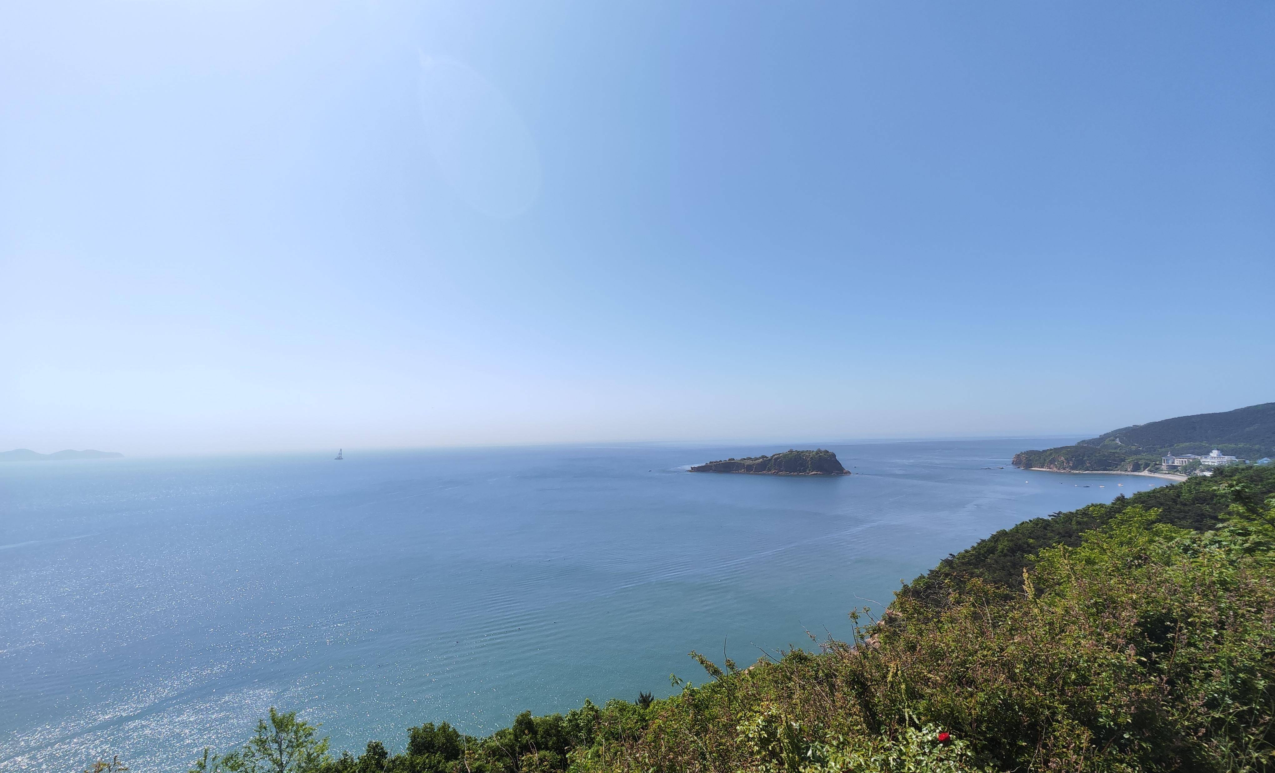 离开怪坡,继续向上,旁边的大海时隐时现,而且坡度也不算大,比刚才在山谷中行走要舒服多了。很快就来到公园的最高点,这里建有一座广场,因为能看到日出,所以取名旭日广场。站在观景平台上,居高临下,只见烟波浩渺,蔚为壮观,这时已经可以看到海中的棒槌岛和岸边的宾馆了,那里正是此次徒步的目的地。