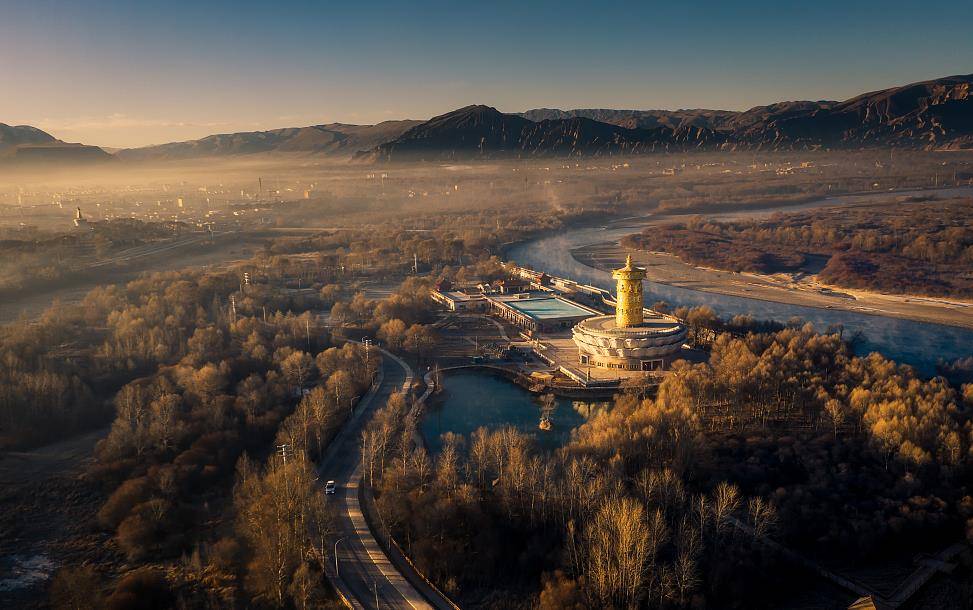 中华福运轮三面环绕人工湖,另一面由“天下黄河贵德清”黄河构成天然屏障,茂密的高原丛林给转经轮增添了神秘的色彩。望着被秋色尽染的树,碧蓝的水和金色的芦苇形成的动人画卷,真是使人沉醉,感觉自己就身处一幅油画中。