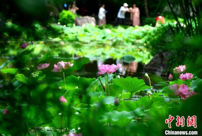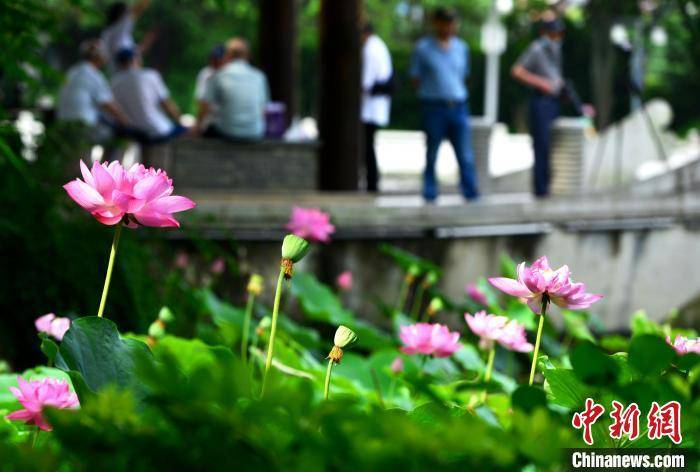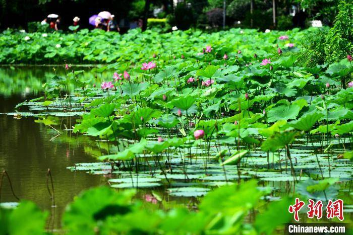 福州茶亭公园盛开的荷花吸引市民前来观赏。 张斌 摄