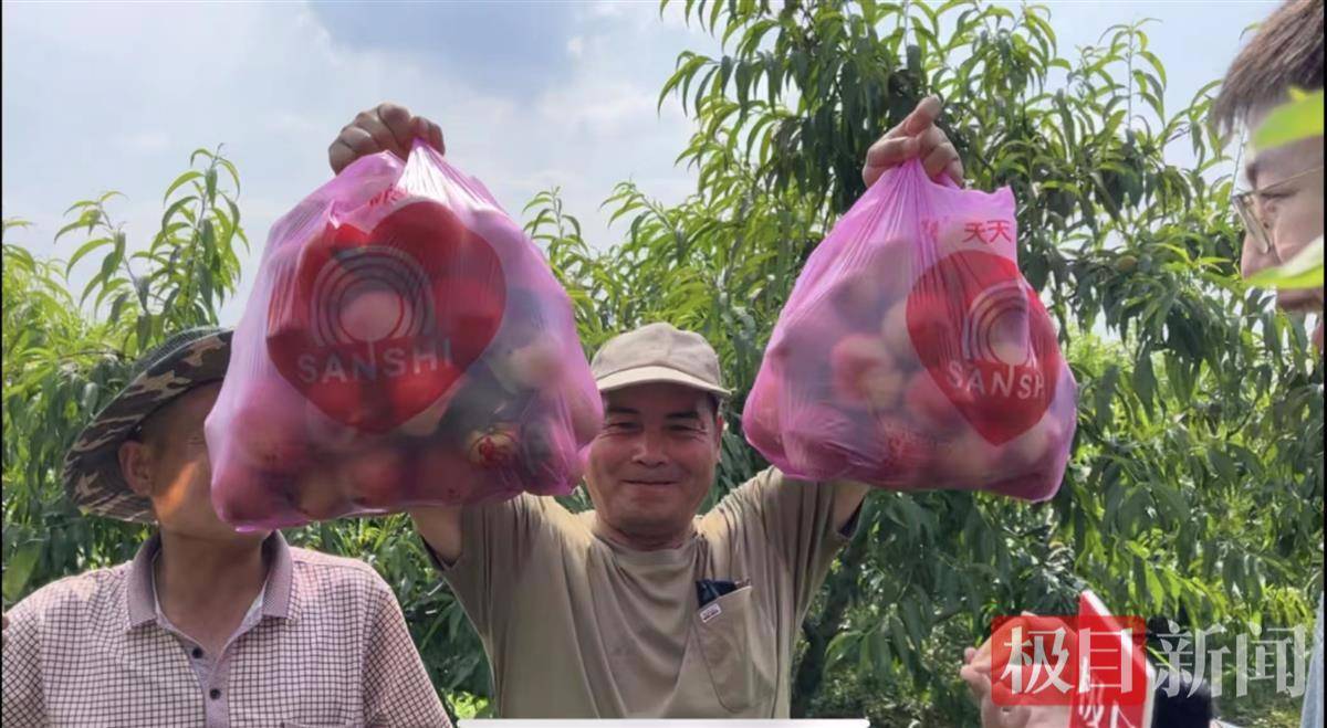 在已经成熟的一片桃林区,8位刚从孝感和武汉东西湖区组团过来的游客,不顾炎热,正在一边开心地摘着桃子一边拍照,现场欢声笑语不断。火红的桃子挂满枝头,掩映在青翠的树叶中。不大会,这群游客就摘满了8个方便袋,一袋桃子约8斤。