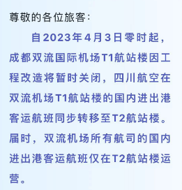 明天,(4月3日)零时起,成都双流国际机场T1航站楼因工程改造将暂时关闭,四川航空在双流机场T1航站楼的国内进出港客运航班同步转移至T2航站楼。届时, 双流机场所有航司的国内进出港客运航班仅在T2航站楼运营。
