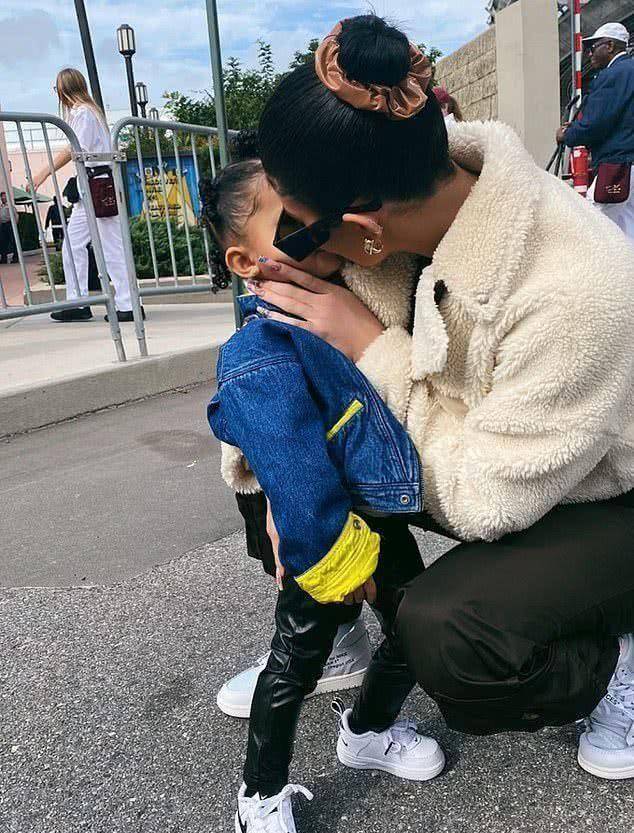 即将两岁的斯托米穿着牛仔夹克,搭配黑色修身皮裤,并且还和妈妈穿着同款的小白鞋。凯莉在镜头前亲吻着女儿,尽显母爱。