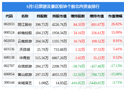 北向资金方面,当日旅游及景区板块北向资金持股市值为16.11亿元,减持0.53亿元。其中增持最多的是丽江股份,增持了891.67万元。减持持最多的是宋城演艺,减持了0.54亿元。旅游及景区板块北向资金持股变动明细见下表: