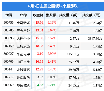 6月5日主题公园板块较上一交易日上涨0.79%,金马游乐领涨。当日上证指数报收于3232.44,上涨0.07%。深证成指报收于10946.08,下跌0.47%。主题公园板块个股涨跌见下表:
