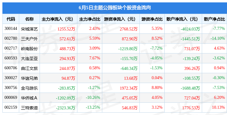 从资金流向上来看,当日主题公园板块主力资金净流出858.58万元,游资资金净流入4633.48万元,散户资金净流出3774.9万元。主题公园板块个股资金流向见下表:
