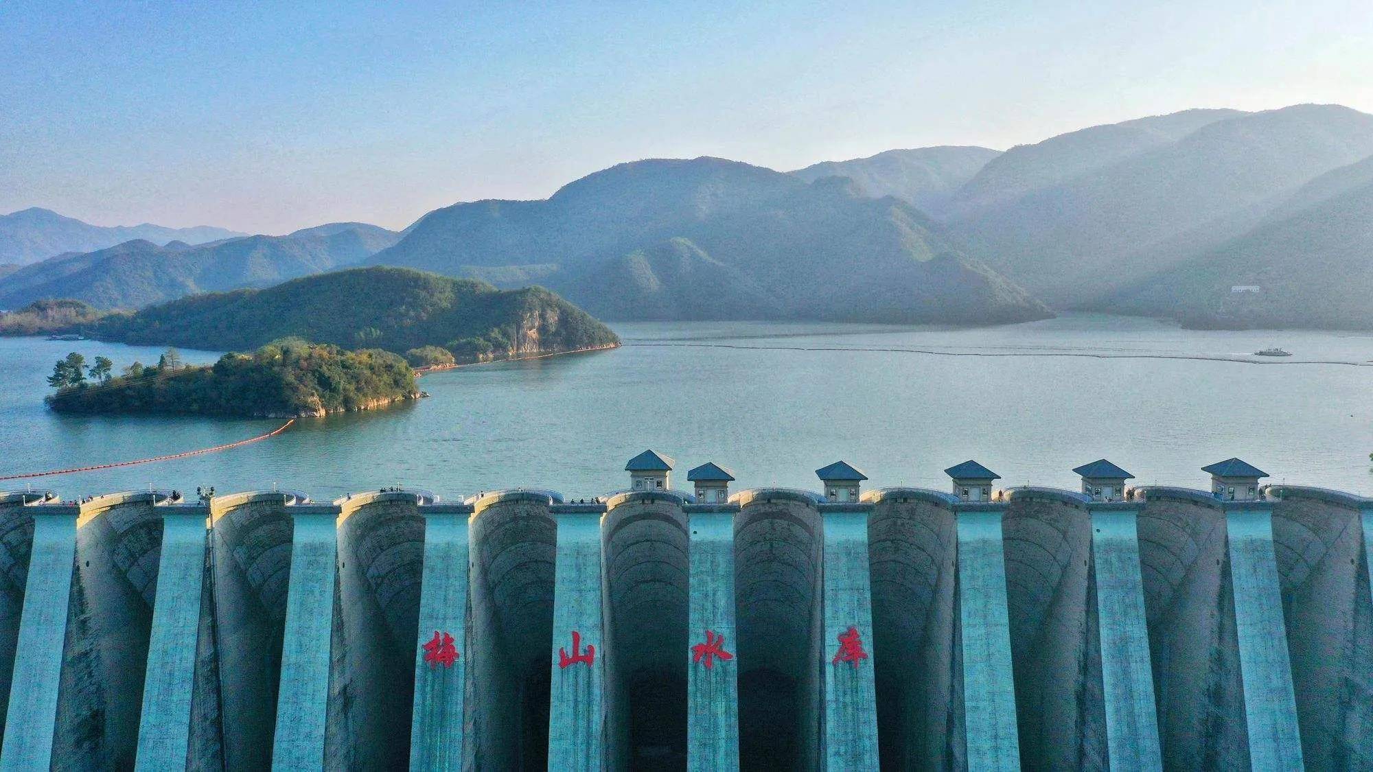 梅山水库主坝是我国自行设计建造的拱坝。当时被称为“世界上最高的水坝”。坝高88.24米,全长443米。拱与拱相连,形成一道优美的弧形线条,犹如长虹卧波一般雄伟壮丽。