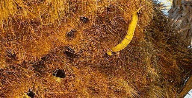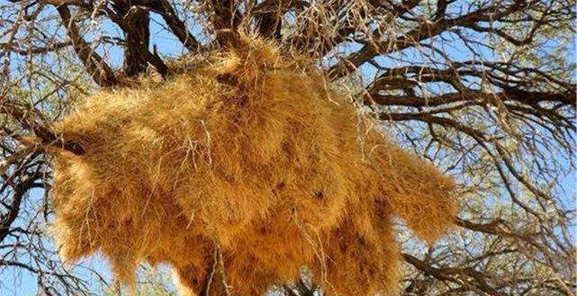 这个鸟巢的建造者就是群织雀,它们会利用青草叶还有柳树纤维等材料,在树上或其他比较高的物体上建造自己的鸟巢。因为它们独特的建造方法,从而使它们鸟巢内部温度更适合它们的居住,但与此同时,它们的天敌非洲树蛇,可能也会在这种鸟巢的舒适区里居住。所以我们人类去参观时一定不能接近,因为非洲树蛇毒性很强,被它伤到会十分危险。
