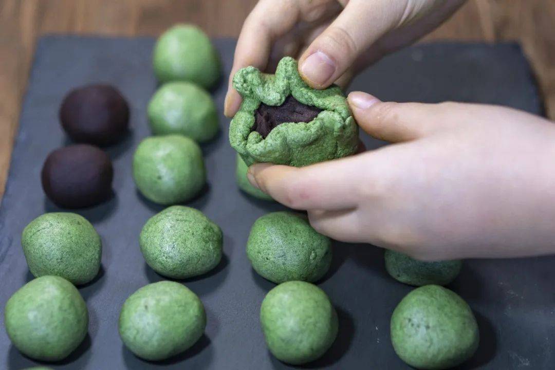 传统的豆沙馅青团