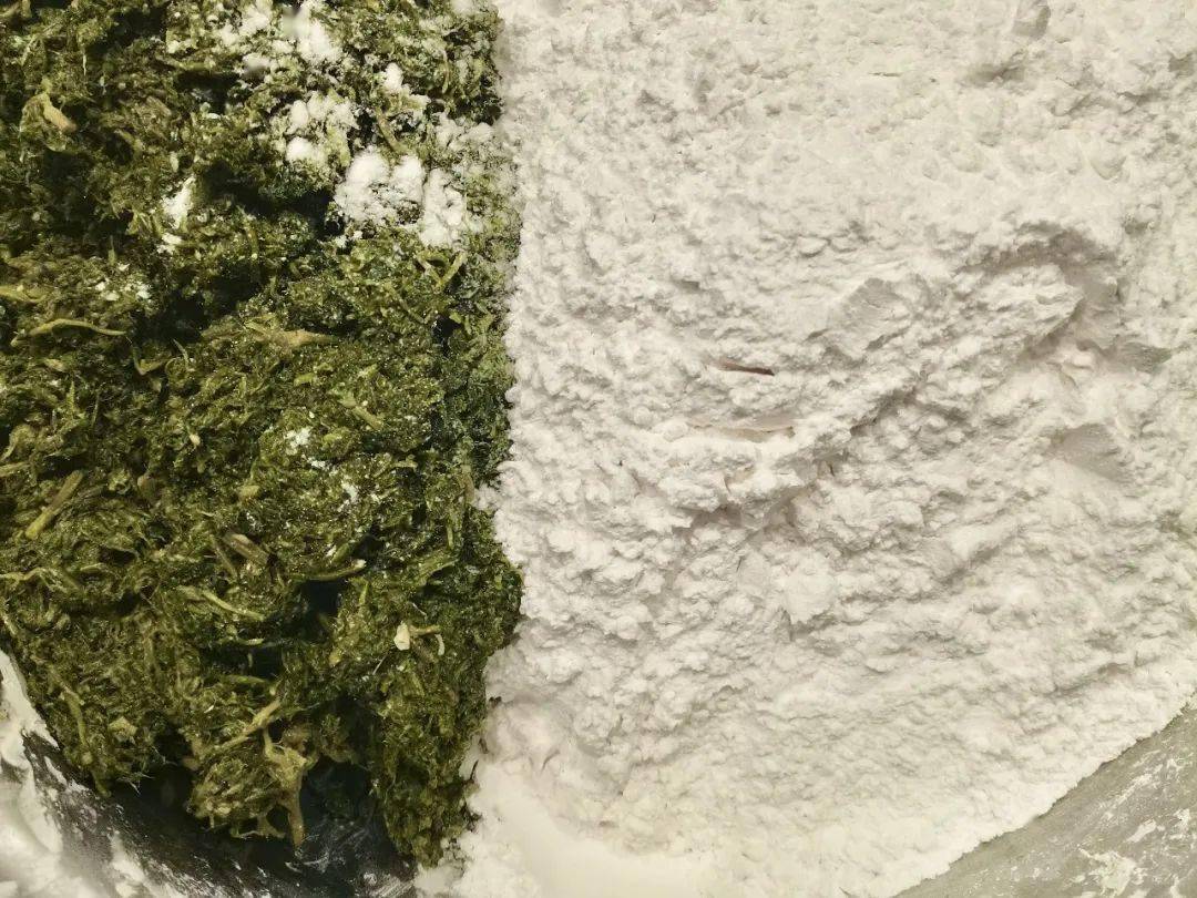 制作青团需要摘出艾草的嫩叶洗净,在沸水中加入少量小苏打煮一分钟;将煮好的艾草剁成泥,或者在机器中打碎,或者手动挤出青汁;