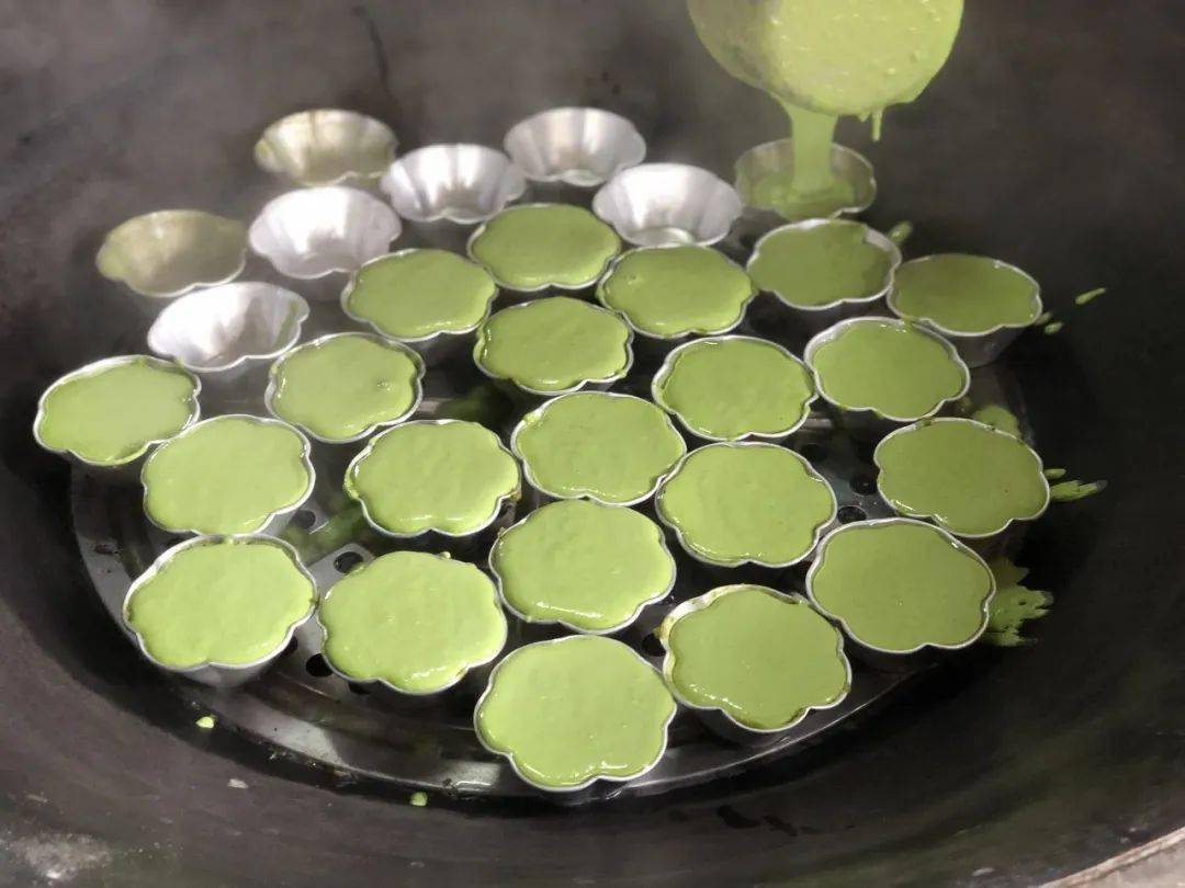 上图:将绿色的米浆倒入碗中准备蒸制