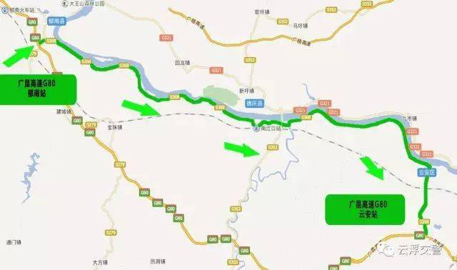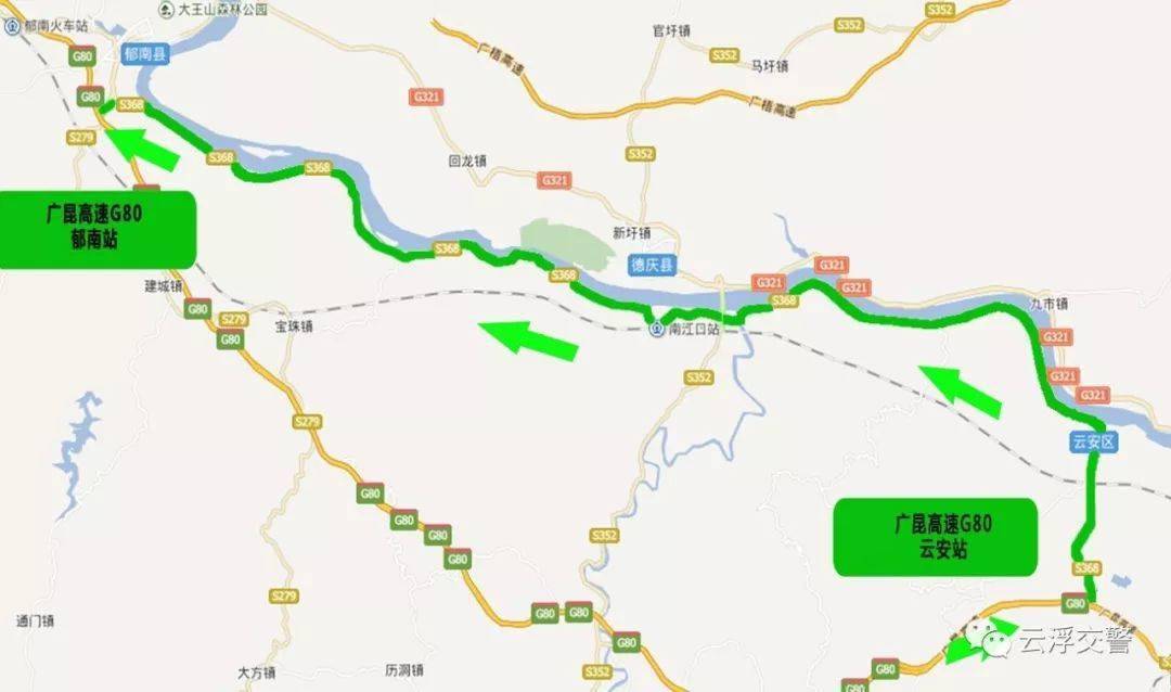车辆拥堵时可绕行路线 ,广昆高速(G80)往广州方向车辆可选择从郁南站下高速,行驶S368省道至广昆高速(G80)云安站上高速;