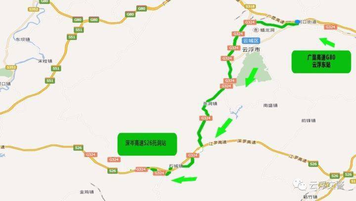 车辆拥堵时可绕行路线, 往广西岑溪方向可选择广昆高速(G80)云浮东站下高速,行驶G324国道至深岑高速(G2518)托洞站上高速。