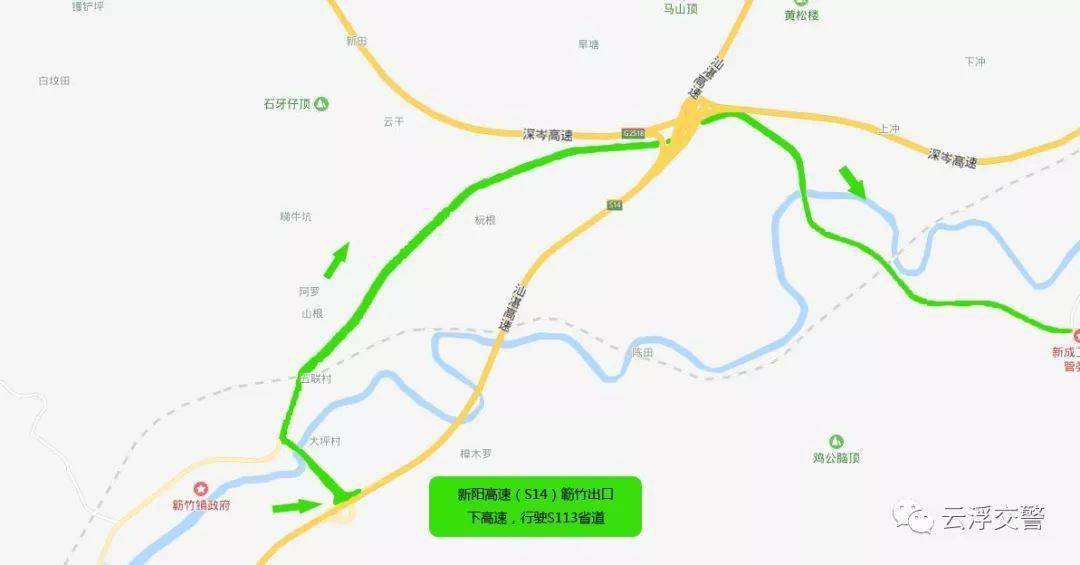 车辆拥堵时可绕行路线 , 在高速公路连接线听从现场分流疏导指挥,提前在新阳高速(S14)簕竹出口下高速,行驶S113省道。