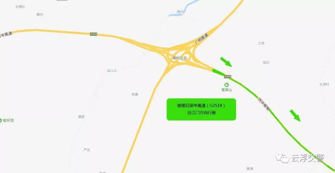 车辆拥堵时可绕行路线 ,在高速公路连接线听从现场分流疏导指挥,继续沿深岑高速(G2518)往江门方向行驶。