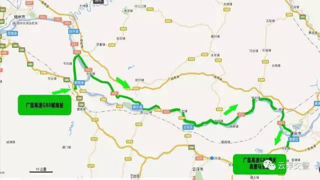 或者提前在广昆高速(G80)肇庆高要马安站下高速,行驶G321国道经封开至广昆高速(G80)郁南站上高速;