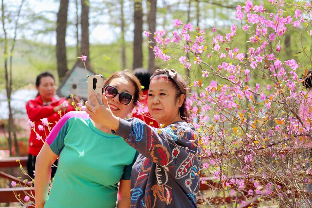 游客在与阿尔山杜鹃合影。(阿尔山市委宣传部供图)