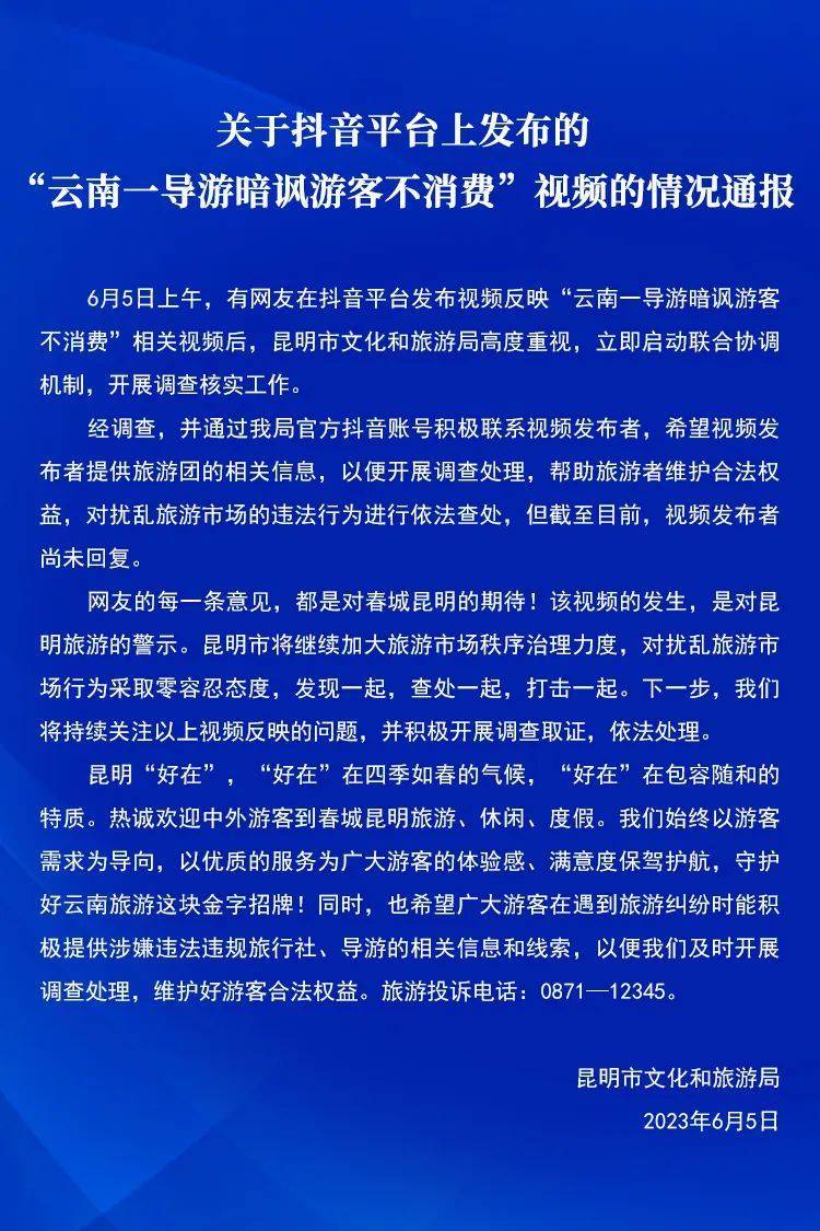 6月5日上午,有网友在抖音平台发布视频反映“云南一导游暗讽游客不消费”相关视频后,昆明市文化和旅游局高度重视,立即启动联合协调机制,开展调查核实工作。经调查,并通过昆明市文化和旅游局官方抖音账号积极联系视频发布者,希望视频发布者提供旅游团的相关信息,以便开展调查处理,帮助旅游者维护合法权益,对扰乱旅游市场的违法行为进行依法查处,但截至目前,视频发布者尚未回复。