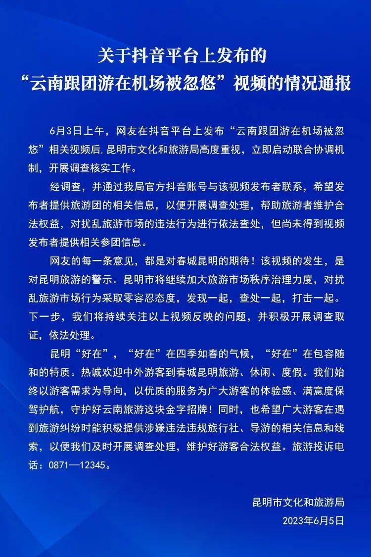 6月3日上午,网友在抖音平台上发布“云南跟团游在机场被忽悠”相关视频后,昆明市文化和旅游局高度重视,立即启动联合协调机制,开展调查核实工作。经调查,并通过昆明市文化和旅游局官方抖音账号与该视频发布者联系,希望发布者提供旅游团的相关信息,以便开展调查处理,帮助旅游者维护合法权益,对扰乱旅游市场的违法行为进行依法查处,但尚未得到视频发布者提供相关参团信息。