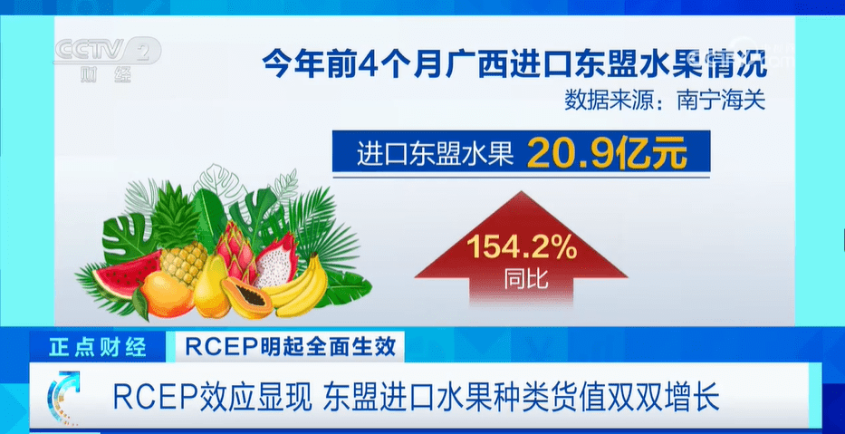 自RCEP生效以来,老挝柑橘、柬埔寨龙眼、缅甸香蕉,越来越多的东盟水果来到中国,丰富了消费者的果篮子,种类增加的同时,进口货值也在大幅增长。根据南宁海关统计,今年前四个月广西进口东盟水果20.9亿元,同比增长154.2%。