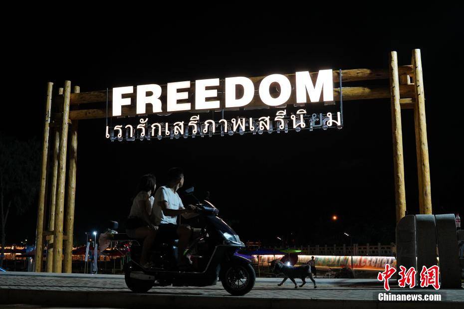 6月5日晚,市民从海南海口“白沙门沙滩市集”国际欢乐海滩项目现场经过。