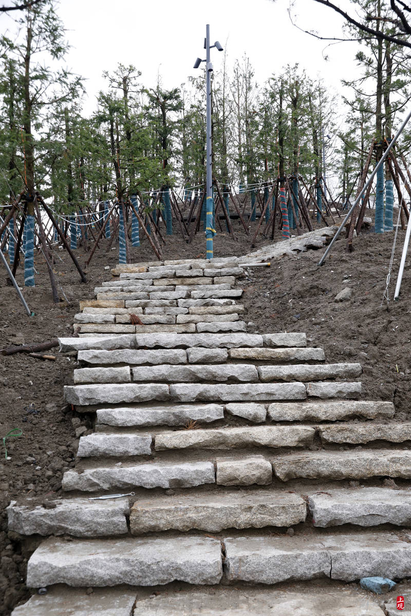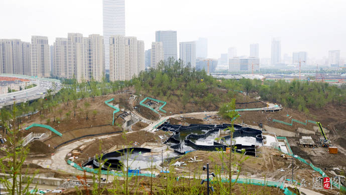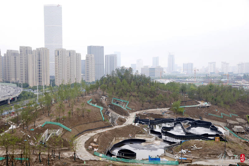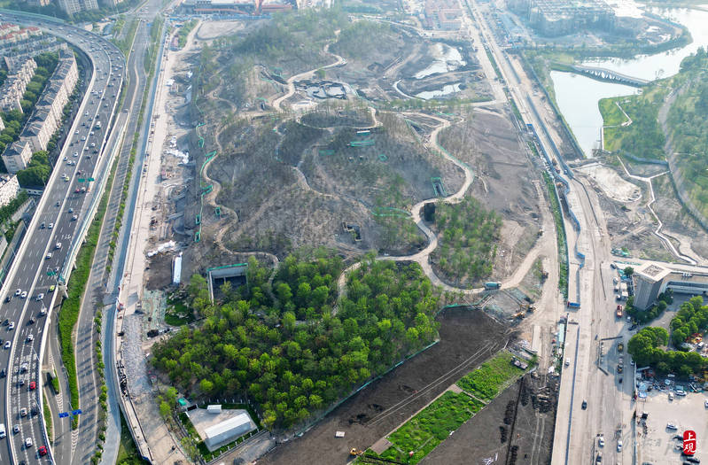 山体绝大部分区域已经完成覆土,不同苗木正在稳步移植,24万平方米绿化面积进度已超六成,今年底将全部完成,确保明年对外开放。