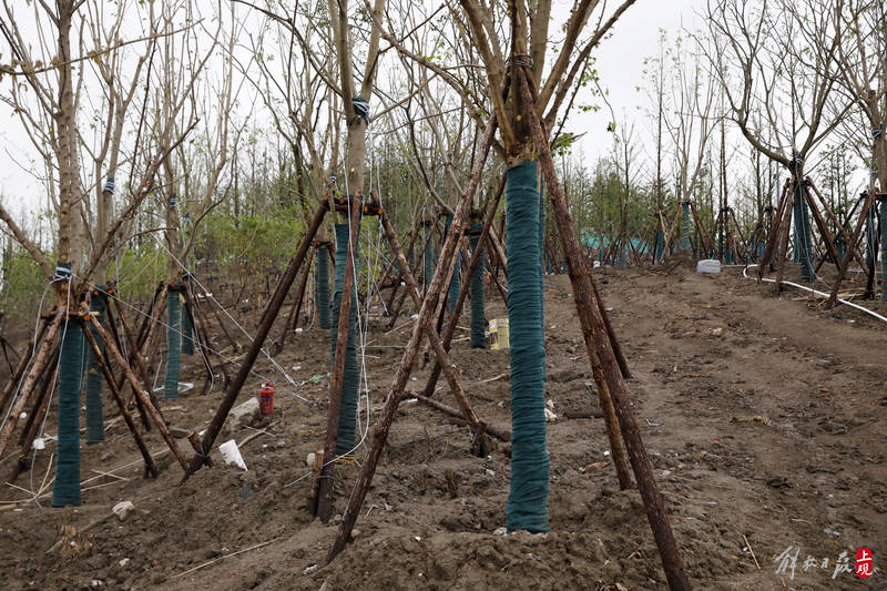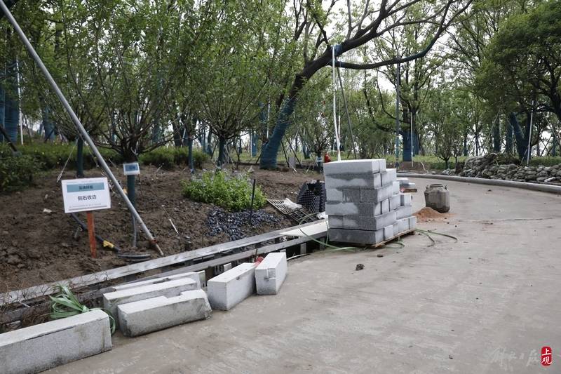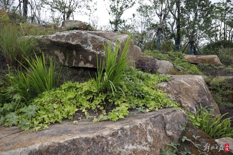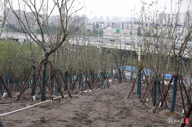 近日,世博文化公园最大在建项目——双子山日渐披绿,近看则草木葱茏。