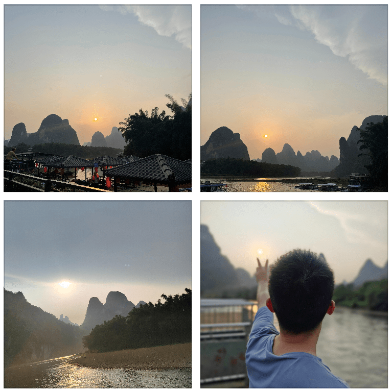 漓江犹如一条蜿蜒流淌的青绸绿带,盘绕在万千峰峦之间,匆匆流过。如诗如画般的漓江,奇峰夹岸,碧水萦回,沿江田园错落有致,景色十分秀美。逸云天的小伙伴迫不及待地开始欣赏独属于阳朔的山水美景,不禁感叹它如诗如画的美景,并拍下了许许多多好看的照片。