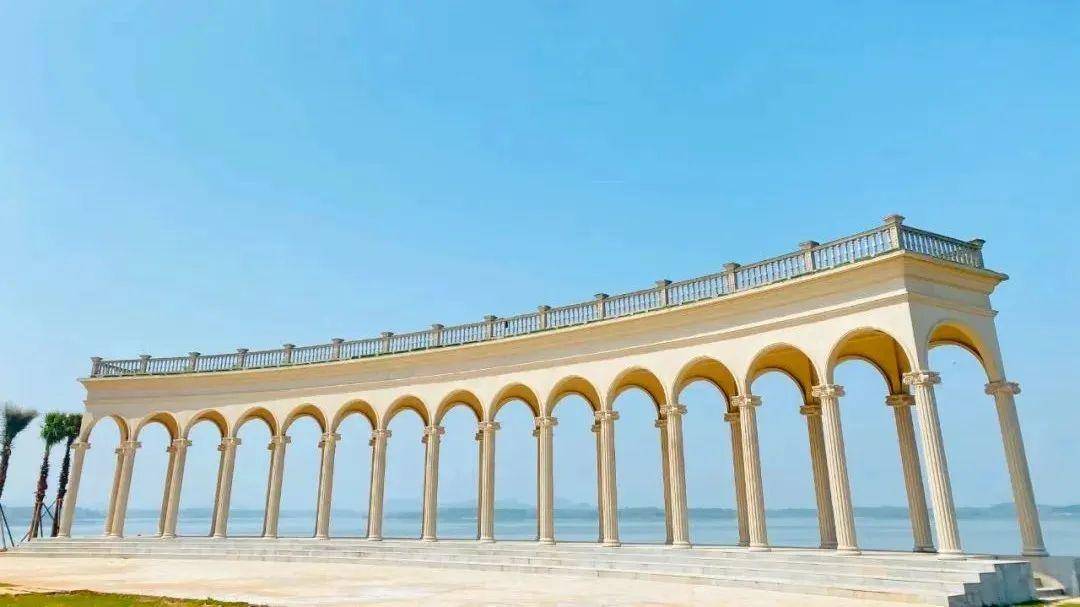 阳光不骄不躁,甜蜜的微风吹过蜜泉湖畔。罗马广场上雕塑造型精美,白色长廊大气流畅,还有蓝顶白墙的希腊式建筑,不用飞渡重洋,家门口的“圣托里尼”就在这里。