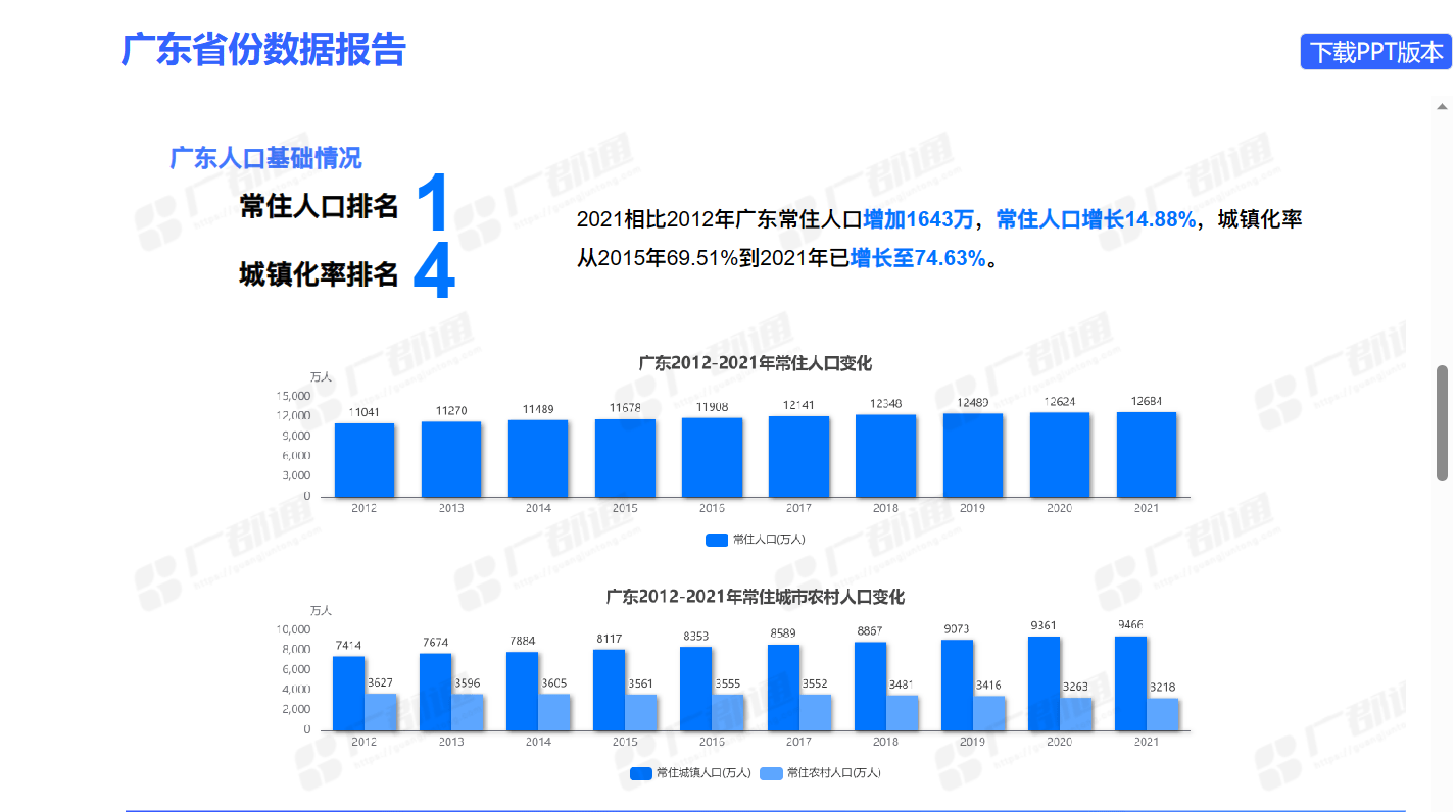 广郡通(guangjuntong.com)是一个查询城市数据平台,可以查询到各地区的常住人口和更多地区的详细情况。