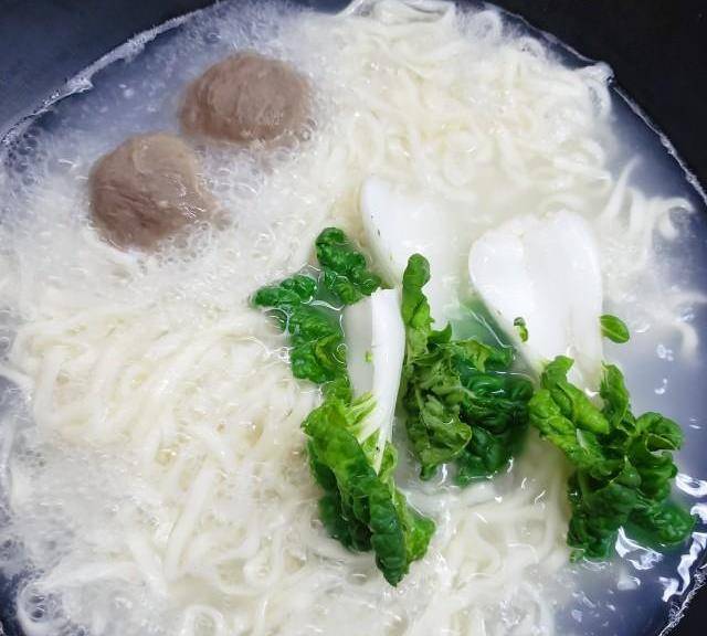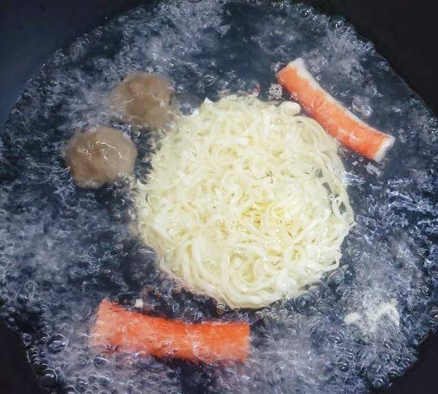 第2步、锅中添一碗水,放入牛肉丸和蟹肉棒,煮熟。配菜可根据自己喜好和冰箱里的库存选。放入面饼,煮5分钟。