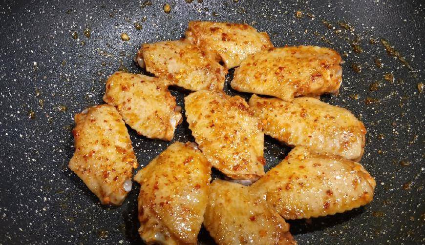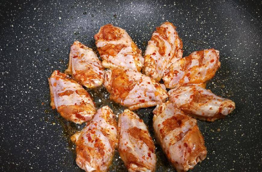 3、不粘锅倒入许油,将腌好的鸡翅挨个放入锅里,中小火煎