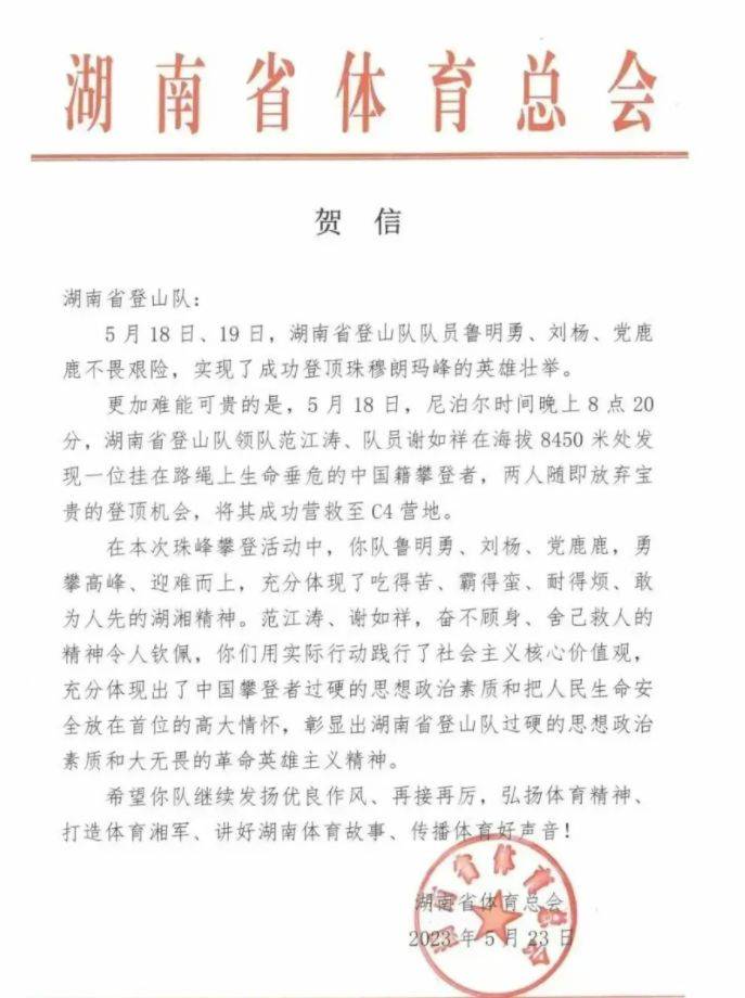 今年5月18日,一位来自湖南的女性登山者L女士,在成功登顶珠峰后,在下撤途中遇到了危险,被两位湖南省登山队的队员范江涛和谢如祥救下。