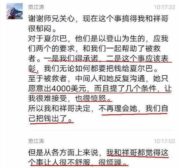 她说她已经花了很多钱在登山上,没有多余的钱给他们。她还说她不知道夏尔巴向导要求了1万美元的救援费用,她觉得这个价格太高了。