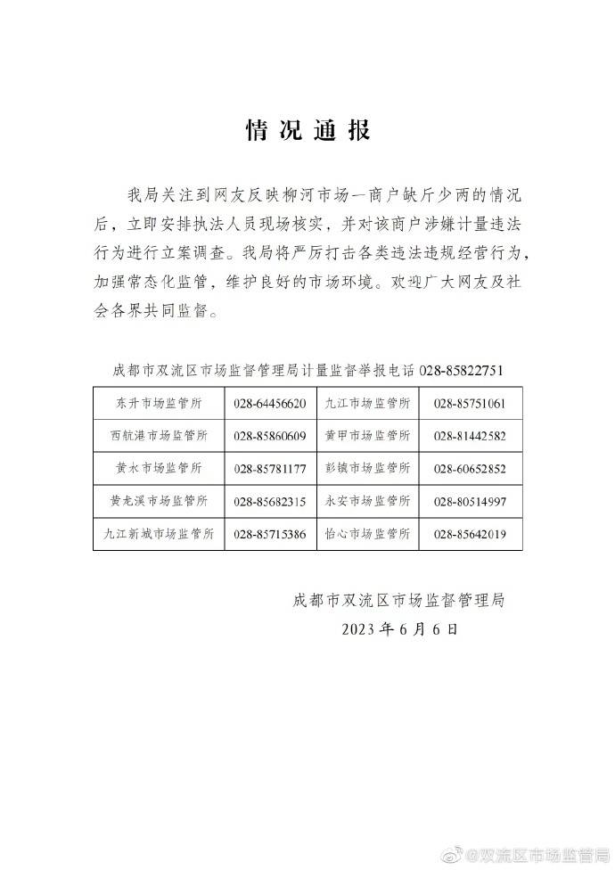 6月6日,成都市双流区市场监督管理局在其官方微博发文表示,该局关注到网友反映柳河市场一商户缺斤少两的情况后,立即安排执法人员现场核实,并对该商户涉嫌计量违法行为进行立案调查。双流区市场监督管理局表示,将严厉打击各类违法违规经营行为,加强常态化监管,维护良好的市场环境。
