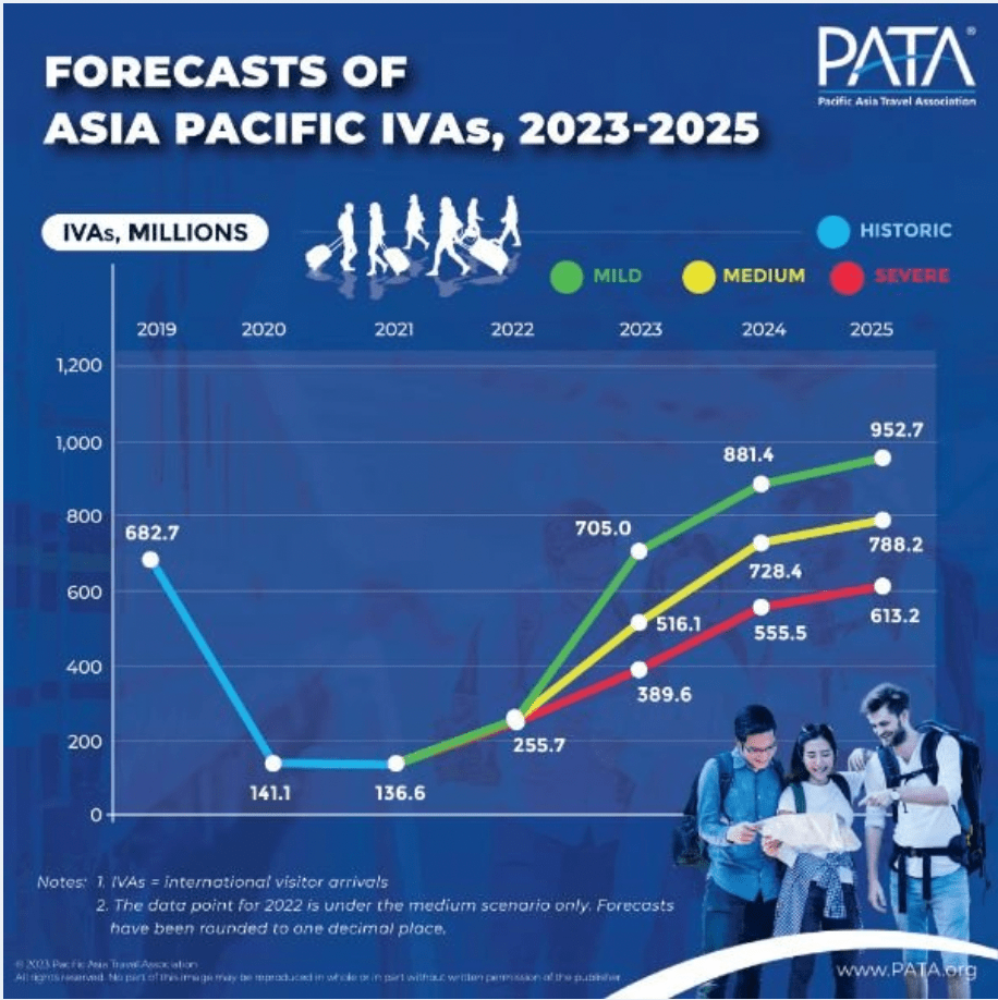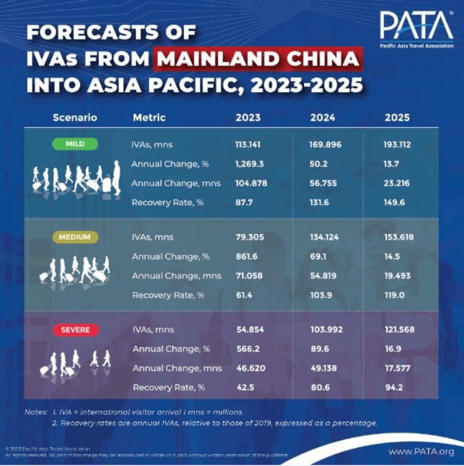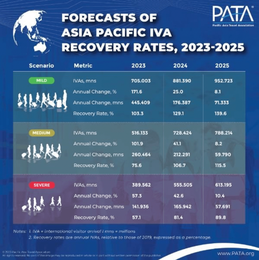 亚太旅游协会(PATA)5月31日发布了对39个亚太旅游目的地的最新预测报告。报告预测,在三种情景下,2023年国际游客总人数(IVA)将呈现非常强劲的增长,这种强劲的年增长将持续到2025年底。