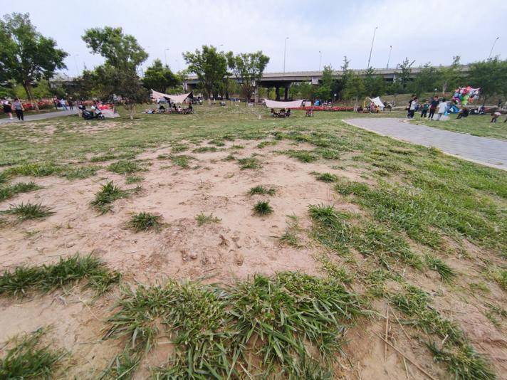 有人对记者说:“看了攻略来的,没想到草坪上能立脚的地方,那么少,还基本都露土了。”