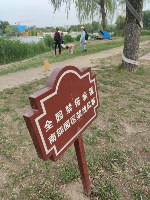 与“南部园区禁放风筝”并列在标牌上的,还有一句“全园禁搭帐篷”。但园内的帐篷还是随处可见。在北湖大草坪,有。在往南一些的草坪,有。快到野鸭岛的岸边草坪,也有。有的帐篷,距离“禁搭帐篷”的标牌还不到10米。