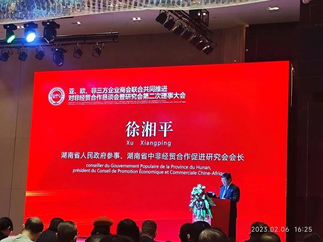会上,湖南省人民政府参事、湖南省中非经贸合作促进研究会会长徐湘平介绍了研究会工作情况。研究会是推动中非合作的重要智库平台,自成立以来,积极探索中非经贸宏观推进体系,充分发挥中非高端智库的重要作用,积极向政府部门建言献策,推动中非技贸措施研究评议基地、中国一带一路网中非经贸专题等落户湖南,助力湖南与非洲经贸合作的高质量发展。