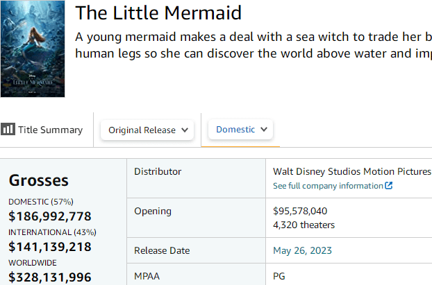 截止6月4日,《小美人鱼》上映10天,北美票房1.87亿美元,海外票房1.41亿美元,全球票房3.28亿美元,预计最终全球总票房可能过不了5亿美元,将低于多年前上映的《灰姑娘》(5.42亿美元)、《沉睡魔咒》(7.6亿美元)等同类作品,更无法与全球大卖12.66亿美元的真人版《美女与野兽》相比。