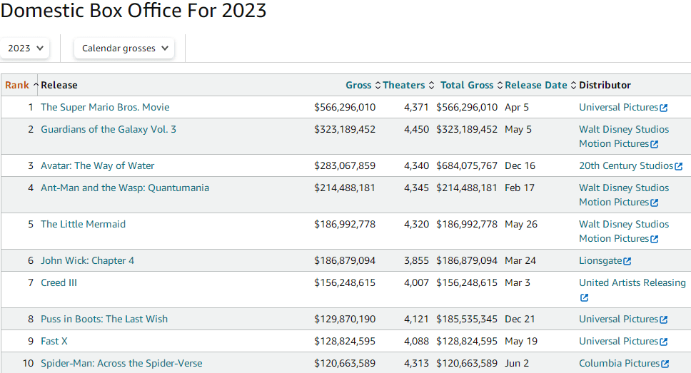 今年,排在票房榜首的是环球影业的《超级马力欧兄弟大电影》,索尼的《蜘蛛侠:纵横宇宙》也来势汹汹,而迪士尼的几部大片,票房全都不及预期,没一部迈过10亿美元大关。