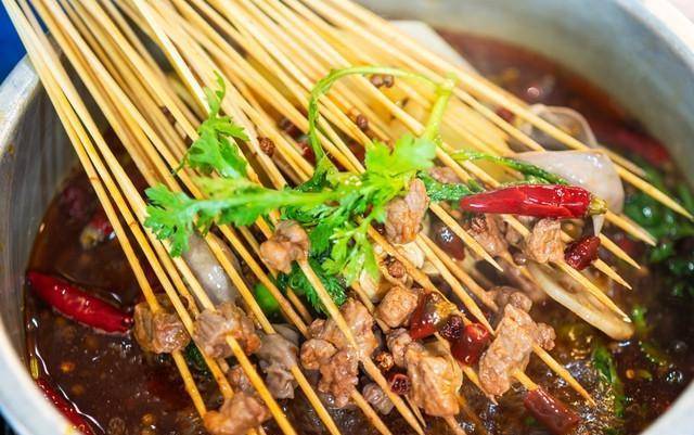 还有麻辣烫,明明川渝火锅都走向世界了,乐山偏偏要吃出点新花样儿,把菜菜用签签儿串起来涮,蘸碟弄的比串串儿还好吃!