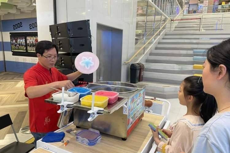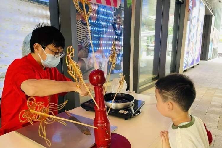 本次游园会设有传统小吃、民间手工艺、手工DIY、垃圾分类小游戏等多个活动摊位,小朋友们打卡每个点位后,可以获得纪念章,完成打卡任务。在传统小吃区,诱人的香味吸引孩子们走近摊位。冰糖葫芦透亮的糖浆包裹着一层又一层,花式棉花糖好看又香甜,栩栩如生的糖画让孩子们目不转睛。
