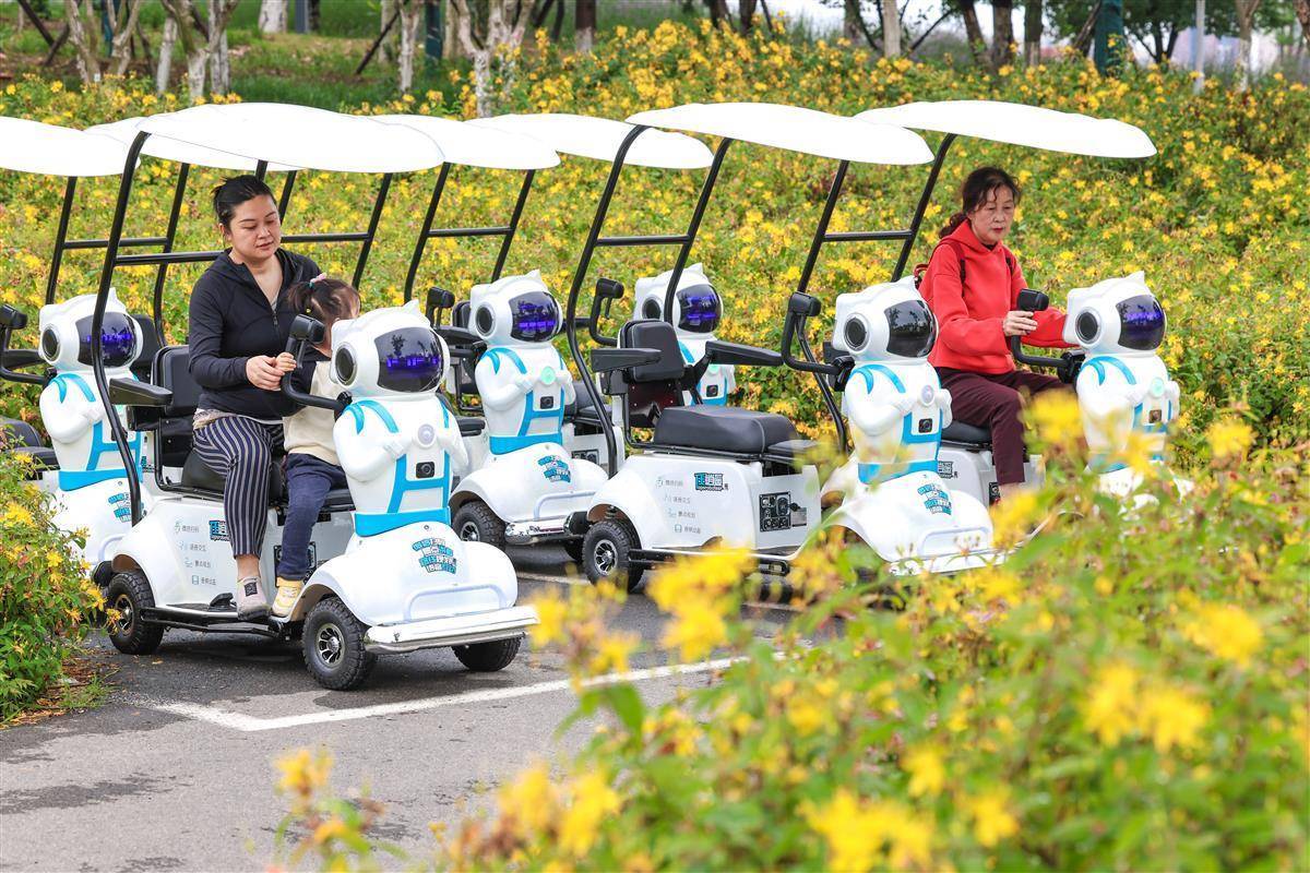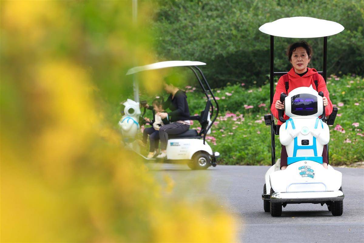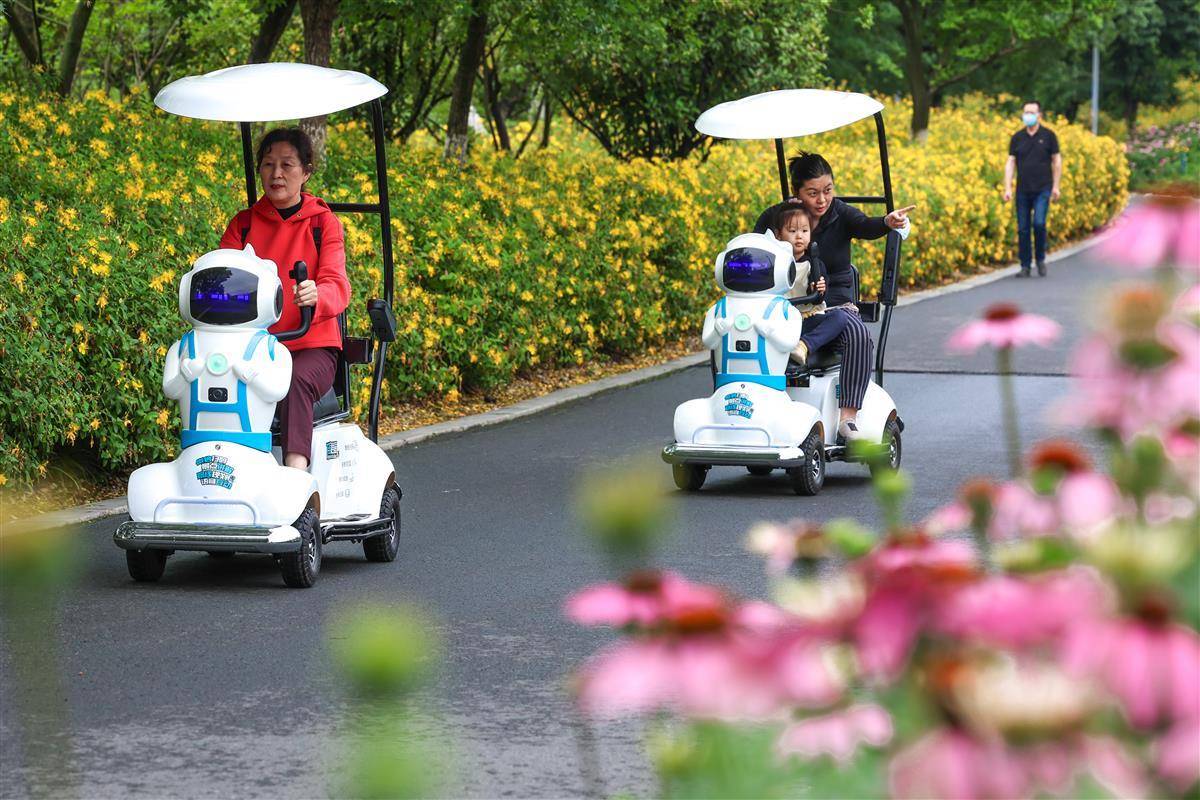 6月5日,在襄阳市月亮湾公园,游客扫码解锁伴游机器人。近期,一批伴游机器人在襄阳市几家城市公园投入使用,相比于简单的景区代步车,伴游机器人更加智能化。