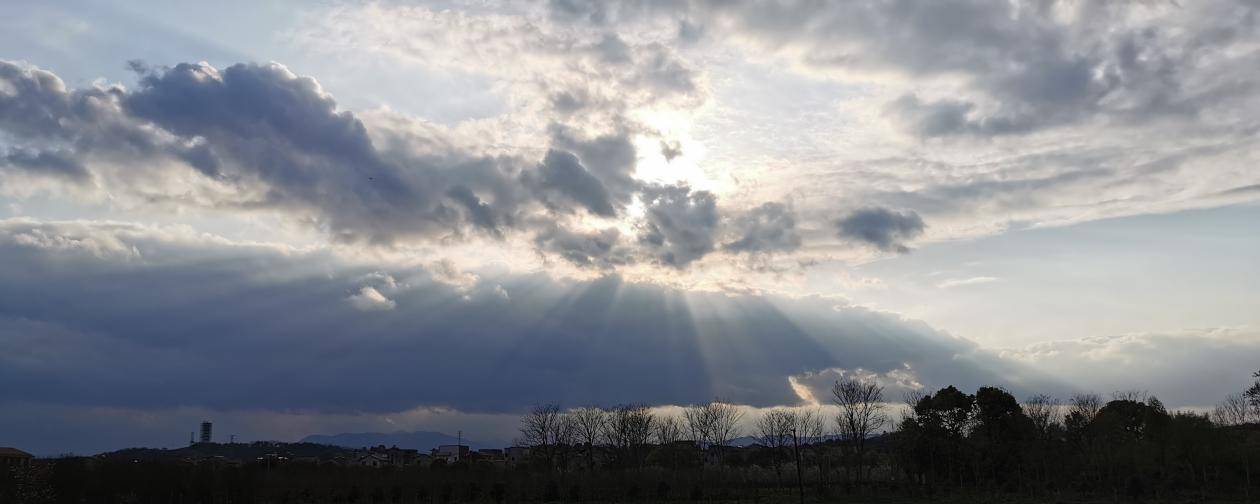 路上的风景:乌云和夕阳在天空创造了魔幻般的丁达尔效应,光影之美,充满动感。