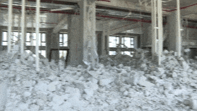而更令人震惊的是,为了提升拆墙进度,施工方甚至将挖掘机械吊到二楼进行作业。